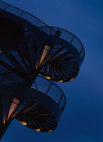 Der Treppenturm aus anthrazitfarbenen Stahlelementen wird nachts mit orangefarbenen LED-Leuchten dezent beleuchtet.