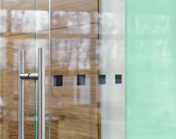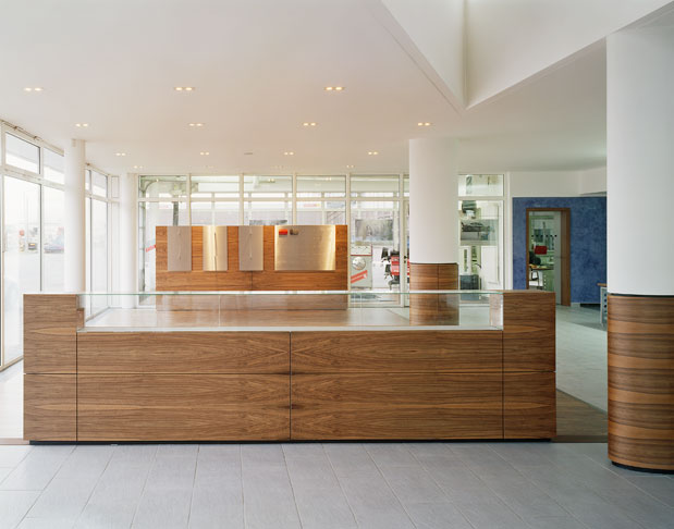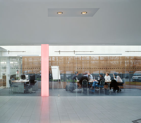 Schrankelemente und Wandverkleidungen aus dunklem Nussbaumfurnier stehen im Kontrast zu den sonst hellen, glatten Flächen. Der Einsatz von Glaswänden vermittelt ein Gefühl der Offenheit und ermöglicht eine direktere Kommunikation der Mitarbeiter untereinander und mit dem Kunden. Das ausgeklügelte Lichtkonzept setzt mit LED-Farbeffekten besondere Akzente.
