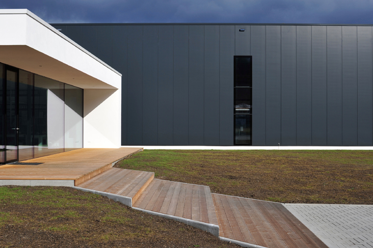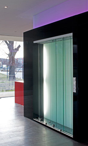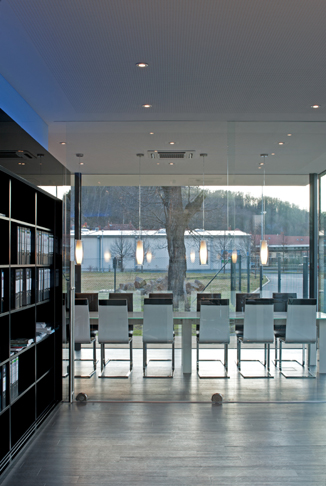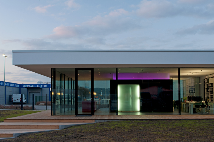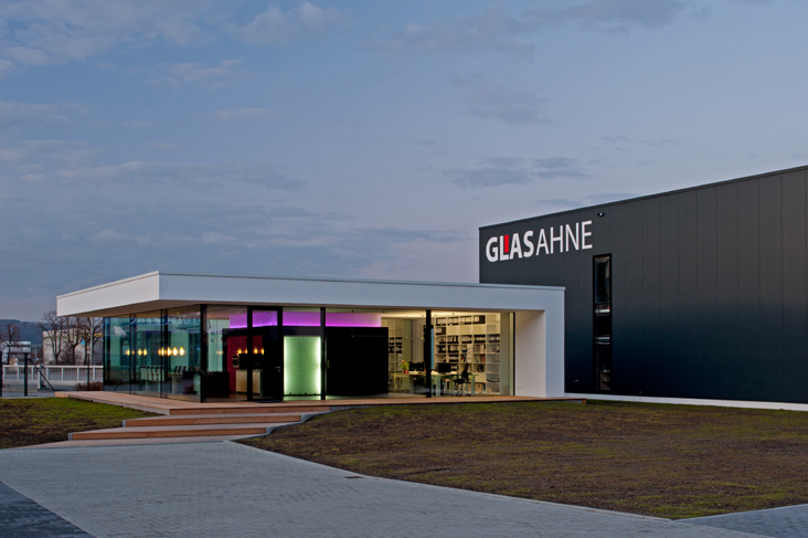 Natürlich spielt das Material Glas eine zentrale Rolle beim Entwurf für das Ausstellungs- und Bürogebäude. Mit effektvollen und dennoch einfachen Mitteln wird Glas hier als Fassadenmaterial mit sehr großformatiger, rahmenloser Dreifachverglasung, als farbig hinterleuchteter Akzentsetzer, als Möbeloberfläche und Raumabtrennung eingesetzt. Das dabei nach außen schlicht wirkende, weiße Gebäude bildet einen wunderbaren Kontrast zu der in edlem Anthrazit gehaltenen Produktionshalle.