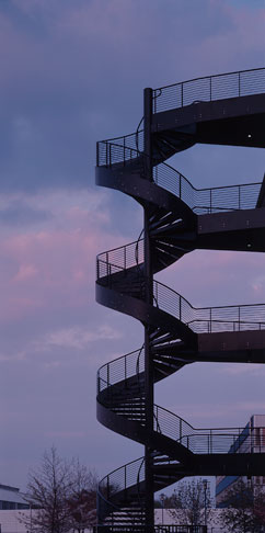 Der Treppenturm aus anthrazitfarbenen Stahlelementen wird nachts mit orangefarbenen LED-Leuchten dezent beleuchtet.