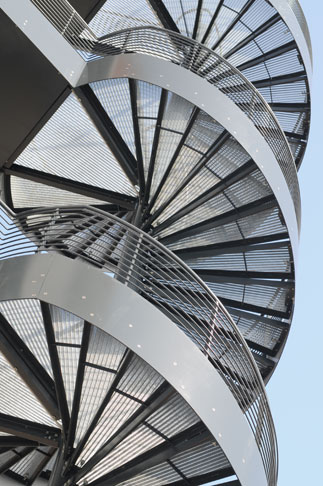 Zeitversetzt hierzu wurde der Flucht-Treppenturm am rückwärtigen Teil des Gebäudes aufgebaut. Der 17m hohe Spindeltreppenturm ist ein formal vom Hauptgebäude losgelöstes und eigenständiges Element, bildet jedoch gleichzeitig auf der weithin sichtbaren Rückseite des Gebäudes einen wichtigen gestalterischen Akzent.
