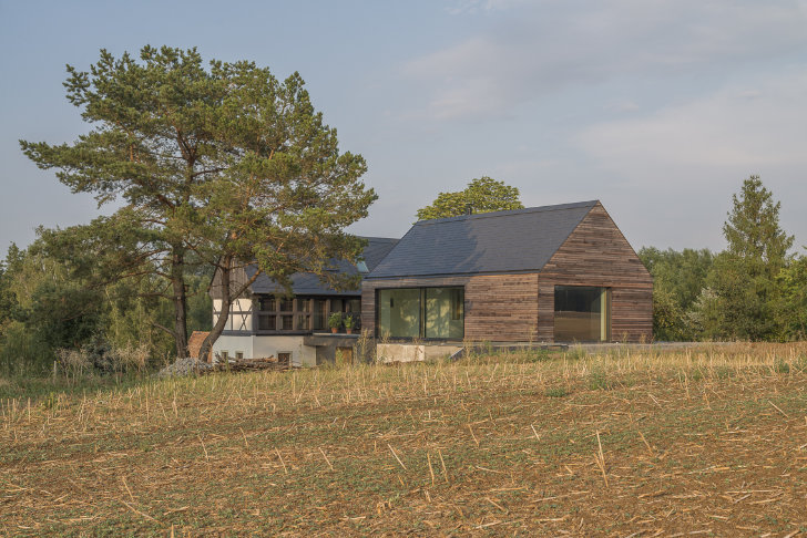 Nach heutigen Raumanforderungen wäre das denkmalgeschützte Haus von ca. 1750 nicht mehr als Wohnhaus nutzbar gewesen. Um eine komfortable Nutzung zu ermöglichen, werden die Gemeinschaftsräume, wie Küche und Wohnraum in einem offen gestalteten Anbau untergebracht, während die privaten Räume, wie Bäder und Schlafräume im gemütlichen Umgebindehaus Platz finden.